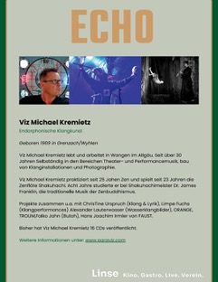 Viz Michael Kremietz ist ein deutscher Klangkünstler und Shakuhachi-Spieler, der 25 Jahre lang den Zen-Buddhismus praktiziert und 30 Jahre lang experimentelle Musik gemacht hat. Er studierte Honkyoku, die alte Meditationsmusik des Zen-Buddhismus, acht Jahre lang mit Shakuhachi-Meister James Franklin und lernte Techniken, die Atemmuster hörbar machen. Seine 16 Studioalben befassen sich mit Schweigen, Atemkontrolle und dem, was er „preverbale und präsymbolische“ klangliche Dimensionen nennt…